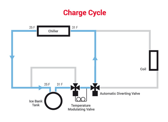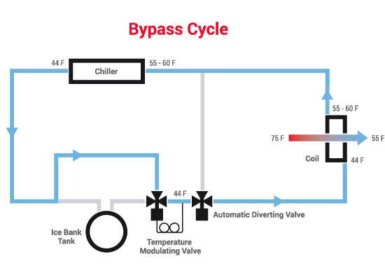 The temperature-modulating valve in the bypass loop has the added advantage of providing unlimited capacity control. During many mild-temperature days in the spring and fall, the chiller will be capable of providing all the necessary cooling for the building without assistance from stored cooling. When the building’s actual cooling load is equal to or lower than the chiller’s capacity, all of the system coolant flows through the bypass loop (see Bypass Cycle).
