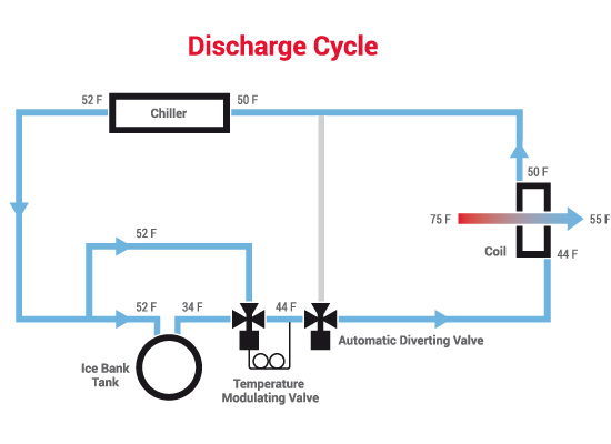 During the peak-load discharge cycle the following day (see Discharge Cycle), the glycol solution leaving the chiller is 52°F, where chiller operation is more efficient than a conventional chiller systems’ requirement of 44°F. Since the ice is downstream of the chiller, in this case, the ice will cool the glycol solution from 52°F to the coil requirement of 44°F. A temperature-modulating valve, set at 44°F in a bypass loop around the tank, permits a sufficient quantity of 52°F solution to bypass the tank, mix with 34°F solution, and achieve the desired 44°F temperature. The 44°F solution is distributed to the air-handler coil, where it cools the air from 75°F to 55°F. The solution leaving the air-handler coil is now 60°F as it re-enters the chiller and is cooled back to 52°F.